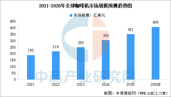 中商情报网讯:咖啡机是专门用于冲煮咖啡的器具。按应用场景,咖啡机分为家用咖啡机及商用咖啡机。按萃取方式,咖啡机一般可分为全自动意式咖啡机、半自动意式咖啡机等。中商产业研究院发布的《2024-2029全球及中国咖啡行业发展现状调研及投资前景分析报告》显示,全球咖啡机市场规模由2021年的190亿美元增加至2024年的306亿美元,复合年增长率为17.2%。中商产业研究院分析师预测,2026年全球咖啡机市场规模将达到408亿美元。