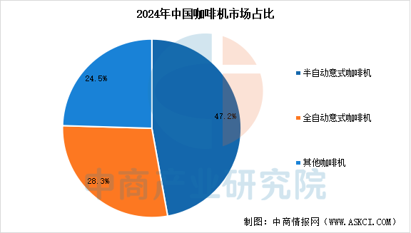 中商产业研究院发布的《2025-2030全球及中国咖啡行业发展现状调研及投资前景分析报告》显示,按功能类型划分,中国咖啡机市场可分为半自动意式咖啡机、全自动意式咖啡机及其他咖啡机,2024年市场规模分别为25亿元、15亿元、13亿元,分别占比47.2%、28.3%、24.5%。