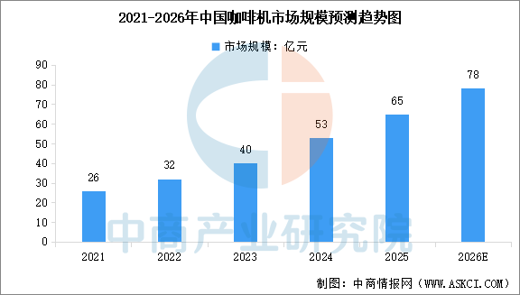 中商情报网讯:咖啡机是专门用于冲煮咖啡的器具。按应用场景,咖啡机分为家用咖啡机及商用咖啡机。按萃取方式,咖啡机一般可分为全自动意式咖啡机、半自动意式咖啡机等。中商产业研究院发布的《2025-2030全球及中国咖啡行业发展现状调研及投资前景分析报告》显示,中国咖啡机市场规模由2021年的26亿元增加至2024年的53亿元,复合年增长率为26.8%。中商产业研究院分析师预测,2026年中国咖啡机市场规模将达到78亿元。