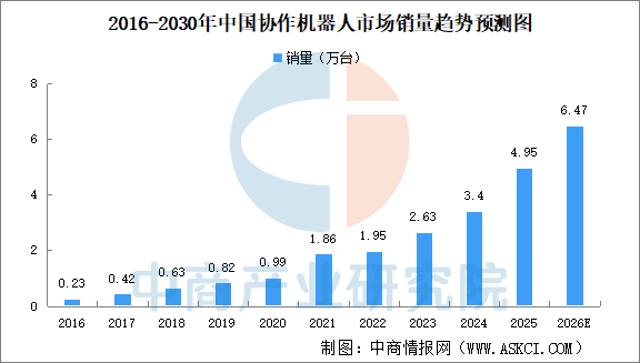 2025年中国协作机器人市场销量约4.95万台,同比增长45.59%。预计2026年中国协作机器人市场销量有望突破6万台,持续保持高增长的态势,到2030年中国协作机器人市场销量有望突破19万台。