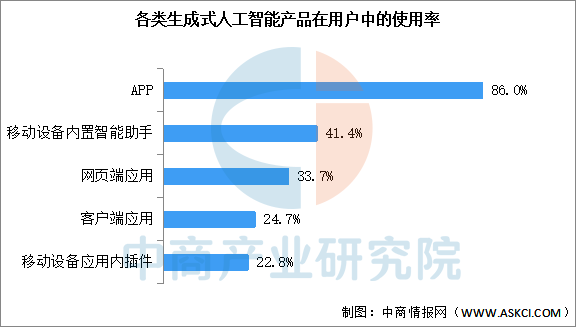 从生成式人工智能产品类型看,生成式人工智能APP在用户中的使用率最高,达86.0%;移动设备厂商内置的智能助手应用对生成式人工智能产品的普及推广也起到很大作用,在用户中的使用率达41.4%。