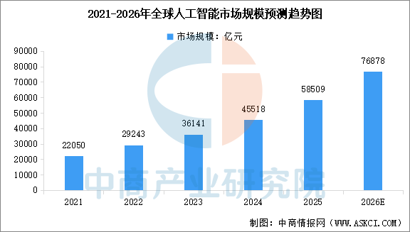 中商情报网讯:随着技术的快速进步、投资的持续激增以及人工智能产品在各行业的广泛应用,人工智能技术正深刻催生全球经济和社会的变革与创新。中商产业研究院发布的《2025-2030年中国人工智能产业现状调查及未来趋势研判报告》显示,全球人工智能市场规模呈指数级增长,从2020年的19141亿元扩大到2024年的45518亿元,复合年增长率为24.2%。中商产业研究院分析师预测,2026年全球人工智能市场规模将达到76878亿元。