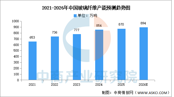 中商产业研究院发布的《2025-2030年中国玻璃纤维行业前景与市场趋势洞察专题研究报告》显示,中国玻纤产能增长边际放缓,处于合理增长的水平。2024年中国玻纤总产能为854万吨,同比增长10%,整体产能增长有所放缓。2025年产能将达870万吨。中商产业研究院分析师预测,到2026年中国玻璃纤维产能将小幅增长至894万吨。