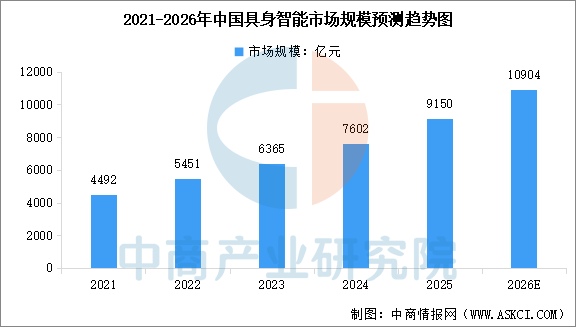 中商情报网讯:在政策与资本双重驱动下,中国具身智能市场规模持续扩大。中商产业研究院发布的《2025-2030年中国具身智能市场调研分析及投资前景研究预测报告》显示,2025年中国具身智能市场规模约9150亿元,同比增长20.4%。中商产业研究院分析师预测,2026年中国具身智能市场规模将达到10904亿元。