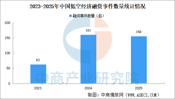 中商情报网讯:近三年,资本市场低空经济相关领域融资活跃,融资事件累计380起。其中,2023年中国低空经济相关领域融资事件63次,2024年发生融资事件数量161次,增长155.6%,2025年发生融资事件156次,下降3.1%。
