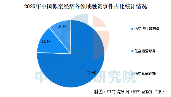 2025年低空飞行器制造领域是持续受到资本市场青睐,融资事件118起,占比75.6%。其次是低空运营服务和低空基础设施,融资事件分别为21起、17起,占比分别为13.5%、10.9%。