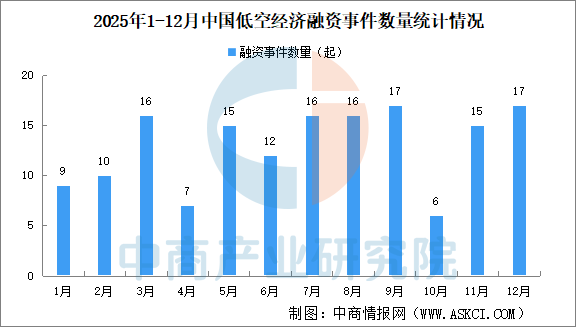 2025年除1月、4月、10月外,其他月份低空经济相关领域融资事件均超10起。其中,9月、12月低空经济相关领域融资事件最多为17起。
