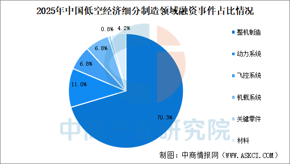 低空飞行器制造领域,整机制造领域融资事件数量最多,占比70.3%,动力系统融资事件占比11.0%,关键零件领域融资事件占比9.8%,飞控系统、机载系统占比均为6.8%、6.8%。