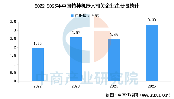 中国特种机器人相关企业注册量呈波动上升态势,行业进入者逐步增多,市场竞争趋于活跃。中商产业研究院发布的《2026-2031年中国特种机器人行业深度研究及发展前景投资预测分析报告》显示,2022年至2025年,中国特种机器人相关企业注册量分别为1.95万家、2.59万家、2.46万家、3.33万家。其中,2023年较上年增长32.8%,2024年出现小幅回落,2025年再次回升并达到近年高点。