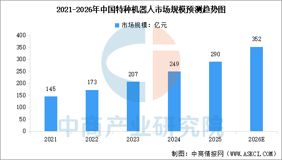 中国特种机器人市场受益于高危行业“机器换人”需求释放及政策持续加码,市场规模保持快速增长态势。中商产业研究院发布的《2026-2031年中国特种机器人行业深度研究及发展前景投资预测分析报告》显示,2025年中国特种机器人市场规模达到290亿元,较上年增长16.67%。中商产业研究院分析师预测,2026年中国特种机器人市场规模将达到352亿元。