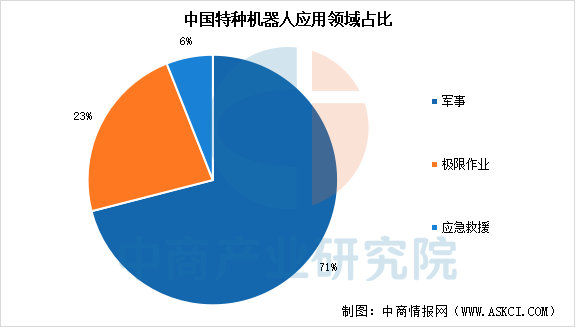 从应用领域来看,当前特种机器人主要服务于国防安全及高危工业场景,应急救援领域的应用比例相对较低。中商产业研究院发布的《2026-2031年中国特种机器人行业深度研究及发展前景投资预测分析报告》显示,2024年中国特种机器人应用领域中,军事领域占比71%,极限作业领域占比23%,应急救援领域占比6%。