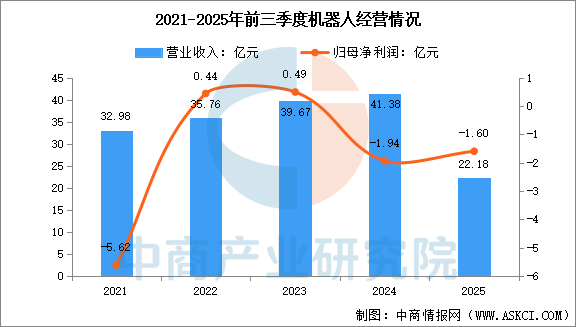 2025年前三季度,新松机器人营业收入为22.18亿元,同比下降8.73%,归母净利润亏损1.60亿元,同比下降59.96%。