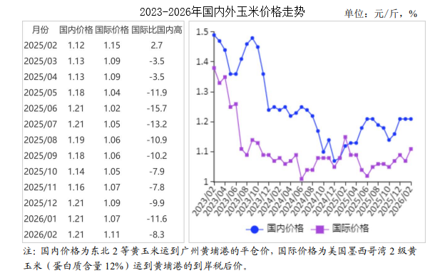 2月份,美国墨西哥湾2级黄玉米平均离岸价折合人民币每斤0.76元,比国内产区批发价低0.37元;进口配额内1%关税的国外玉米运抵我国南方港口的到岸税后价每斤1.11元,比国内玉米到港价低0.10元,价差比上月缩小0.04元;配额外65%关税的美国玉米运抵我国南方港口到岸税后成本每斤1.77元,比国内玉米到港价高0.56元。