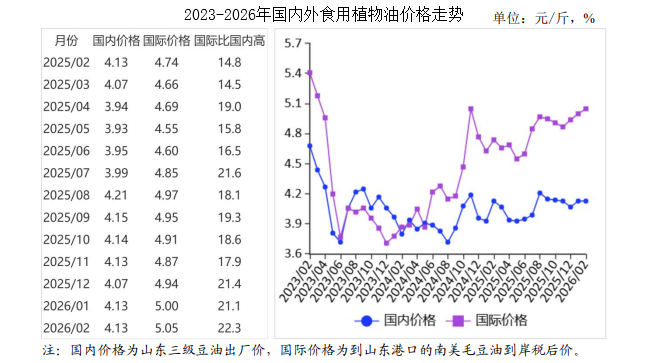 2月份,9%关税下的加拿大油菜籽到我国口岸的税后价格每斤2.39元,比国内油菜籽入厂价每斤低0.51元,价差比上月缩小0.08元;美国墨西哥湾豆油离岸价每吨1234美元,折人民币每斤4.29元,比国内销区豆油价格高0.16元,价差比上月扩大0.01元;天津口岸的进口豆油税后价每斤5.05元,比当地国产豆油出厂价每斤高0.92元,价差比上月扩大0.05元。