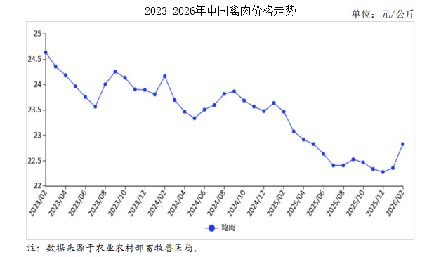 中商情报网讯:2026年2月,禽肉价格回升。禽肉供给少于上年同期,而消费进入季节性淡季,预计后期价格仍将偏弱运行。