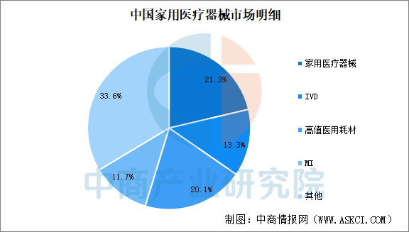 医疗器械主要分为家用医疗器械、IVD、高值医用耗材、MI。2025年中国家用医疗器械市场占比21.3%,高值医用耗材占比20.1%,IVD、MI占比分别为13.3%、11.7%。