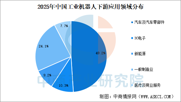 工业机器人下游应用领域广泛,主要应用于汽车及汽车零部件、3C电子、新能源、一般制造业、医疗及商业服务等领域。2025年汽车及汽车零部件领域占比49.2%。一般制造业占比24.1%,3C电子占比10.3%。