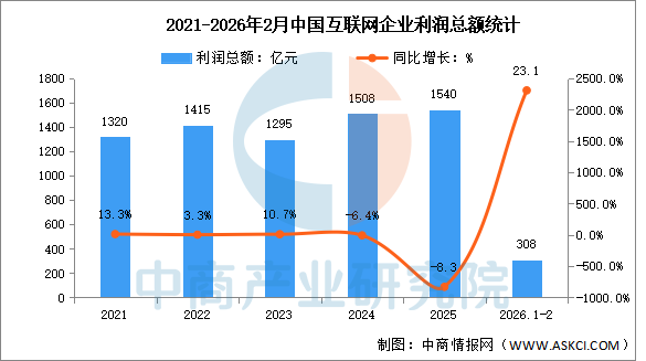 利润总额实现快速增长。1-2月份,我国规模以上互联网企业实现利润总额308亿元,同比增长23.1%。