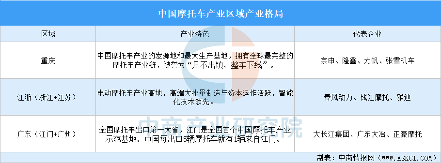 中商情报网讯:中国摩托车产业形成了特色鲜明的区域产业格局,主要集中于三大核心区域,各区域依托自身资源禀赋与发展路径,形成了差异化的竞争优势。