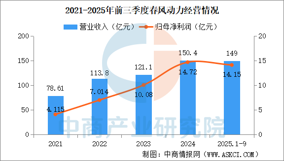 2025年前三季度,春风动力营收约149亿元,同比增加30.1%;归属于上市公司股东的净利润约14.15亿元,同比增加30.89%;