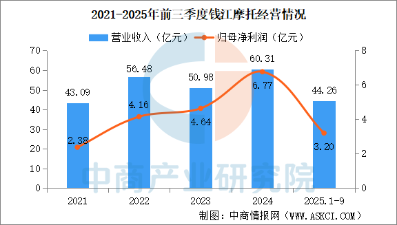 2025年前三季度,钱江摩托实现营业收入44.26亿元,同比下降10.11%;归属于上市公司股东的净利润3.20亿元,同比下降31.38%。