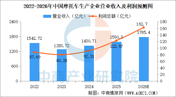 中国摩托车行业在2022年至2025年间,经历了从疫情冲击下的“增收不增利”到结构升级驱动的高质量增长,营收与利润均实现了稳健提升。中商产业研究院发布的《2026-2031全球及中国摩托车行业发展现状调研及投资前景分析报告》显示,2025年中国摩托车生产企业实现营业收入1590.30亿元,同比提高10.73%;实现利润总额122.97亿元,同比提高34.11%。中商产业研究院分析师预测,2026年中国摩托车生产企业实现营业收入将达1785.4亿元,利润总额将达162.7亿元。