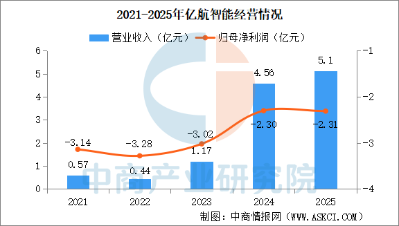 2025年,亿航智能总收入为5.10亿元,同比增长11.7%;净利润亏损2.31亿元,去年同期为-2.30亿元。具体业务上,其电动垂直起降(eVTOL)航空器销售与交付数量达221架,创历史新高,其中包括215架EH216系列与6架VT35。