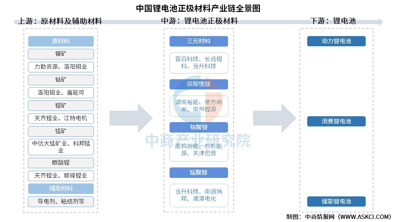 锂电池正极材料产业链上游为矿物原材料,原材料主要包括锂、钴、镍、锰等矿物原料及其化合物,如碳酸锂、氢氧化锂、硫酸镍、硫酸钴、硫酸锰等。辅助材料包括导电剂、粘结剂等;中游为锂电池正极材料的生产制造过程,包括磷酸铁锂材料、三元材料、钴酸锂材料、锰酸锂材料等;下游应用于锂离子电池行业。