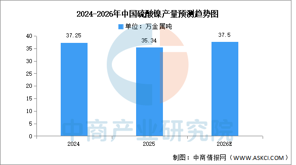 硫酸镍是制备锂电池正极材料的关键原料之一,在三元锂电池的制造过程中,硫酸镍与钴盐、锰盐等原料一起,通过一系列化学反应生成正极材料的前驱体,进而形成最终的正极材料。中商产业研究院发布的《2026-2031年中国硫酸镍市场调查与行业前景预测专题研究报告》显示,2025年中国硫酸镍产量约达35.34万金属吨,同比下降5.1%。中商产业研究院分析师预测,2026年中国硫酸镍产量将恢复增长到37.5万金属吨左右。