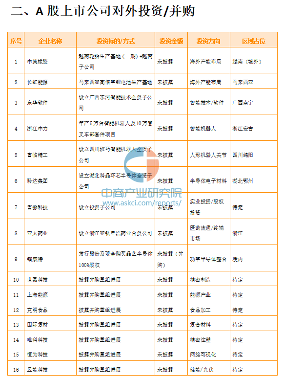 A股上市公司对外投资/并购38个,投资方向主要涉及汽车、智能机器人、精密制造等领域。