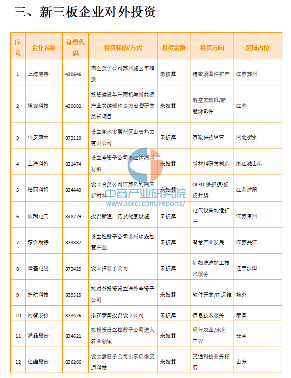 新三板企业对外投资14个,投资方向涉及航空航天、新材料等领域。