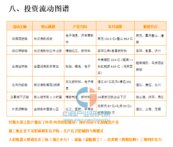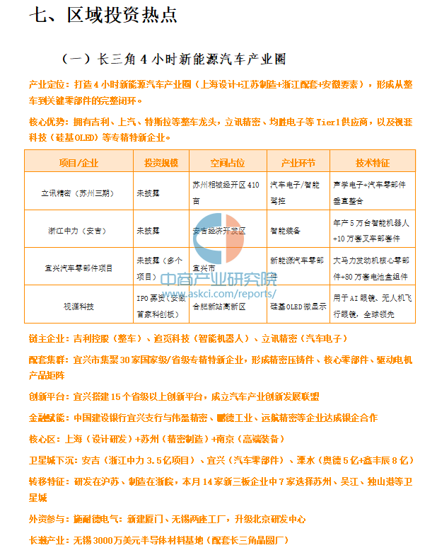 本章节重点分析长三角4小时新能源汽车产业圈、珠三角绿色石化产业带、成渝西部产业转移主阵地、京津冀人形机器人创新发展高地投资热点。