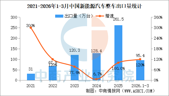 2026年3月,新能源汽车出口37.1万辆,环比增长31.6%,同比增长1.3倍。2026年1-3月,新能源汽车出口95.4万辆,同比增长1.2倍。