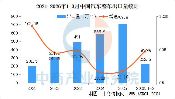 中商情报网讯:2026年3月,汽车出口87.5万辆,环比增长30.2%,同比增长72.7%。2026年1-3月,汽车出口222.6万辆,同比增长56.7%。