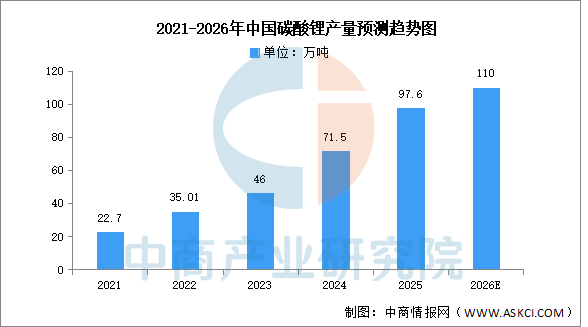 碳酸锂是锂离子电池的一种重要材料,主要作为正极材料使用。近年来中国碳酸锂产量呈现增长趋势,中商产业研究院发布的《2026-2031全球与中国电池级碳酸锂市场现状及未来发展趋势》显示,2025年中国碳酸锂产量97.6万吨,产量同比增长39.3%。中商产业研究院分析师预测,2026年中国碳酸锂产量将达到110万吨。