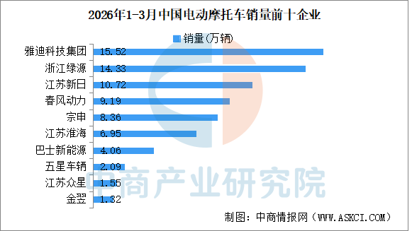 1-3月,全国电动摩托车销售前十名企业(集团)为雅迪科技集团、浙江绿源、江苏新日、春风动力、宗申、江苏淮海、巴士新能源、五星车辆、江苏众星、金翌,分别销售15.52万辆、14.33万辆、10.72万辆、9.19万辆、8.36万辆、6.95万辆、4.06万辆、2.09万辆、1.55万辆和1.32万辆,10家企业共销售电动摩托车74.11万辆,占电动摩托车总销量93.64%。