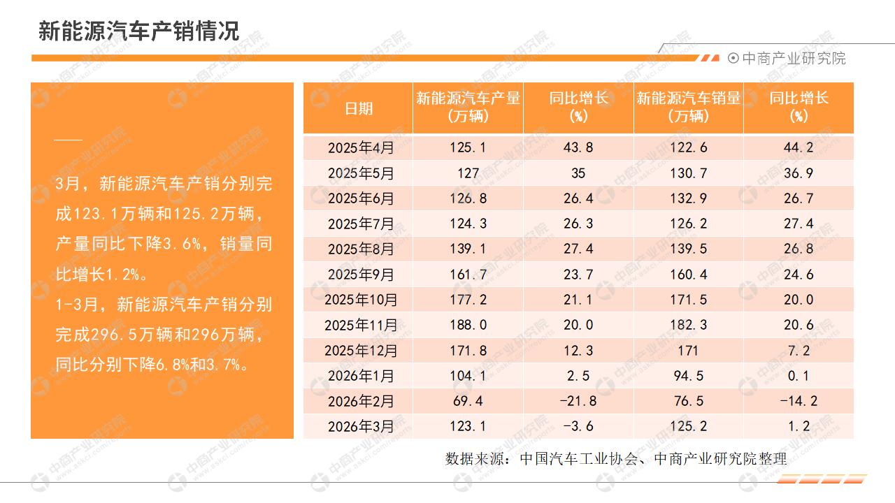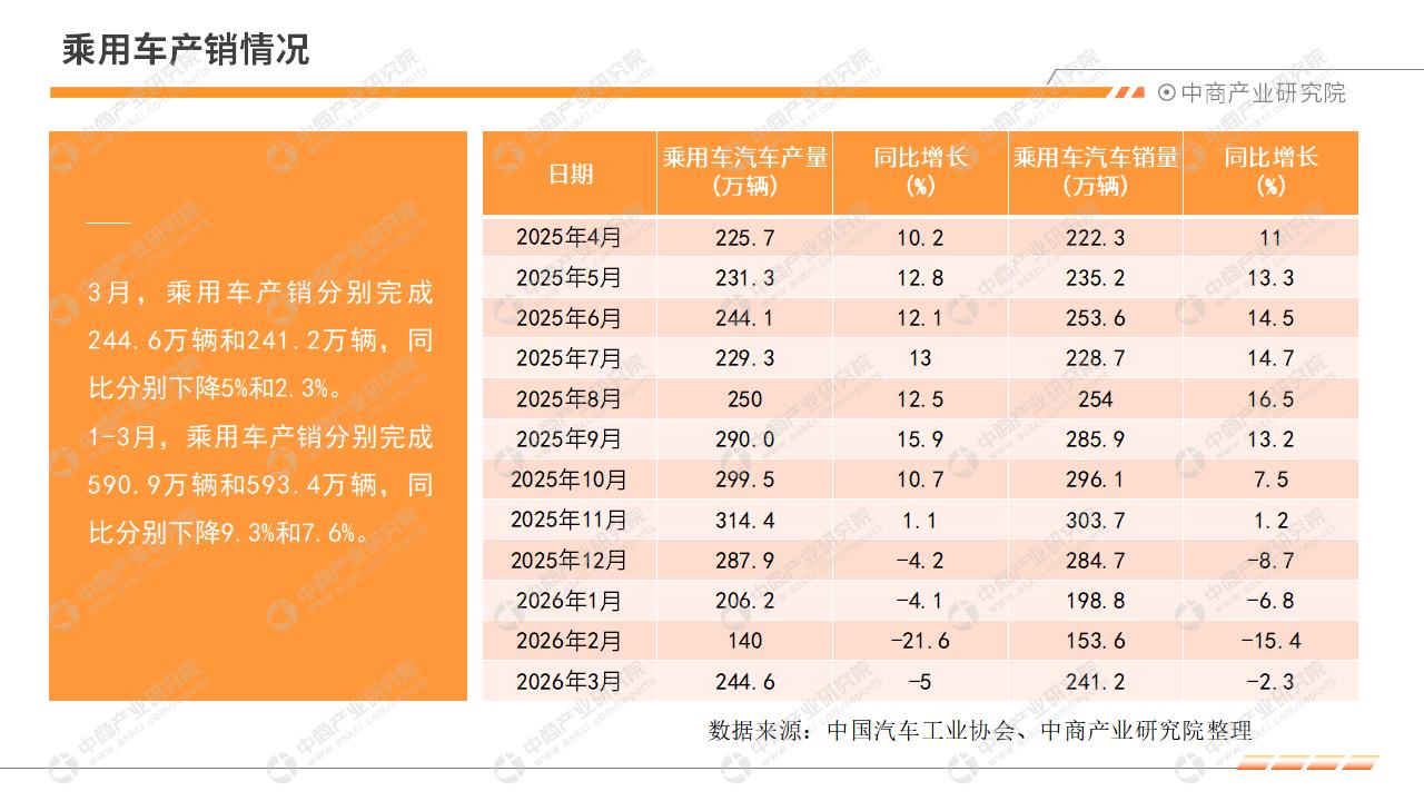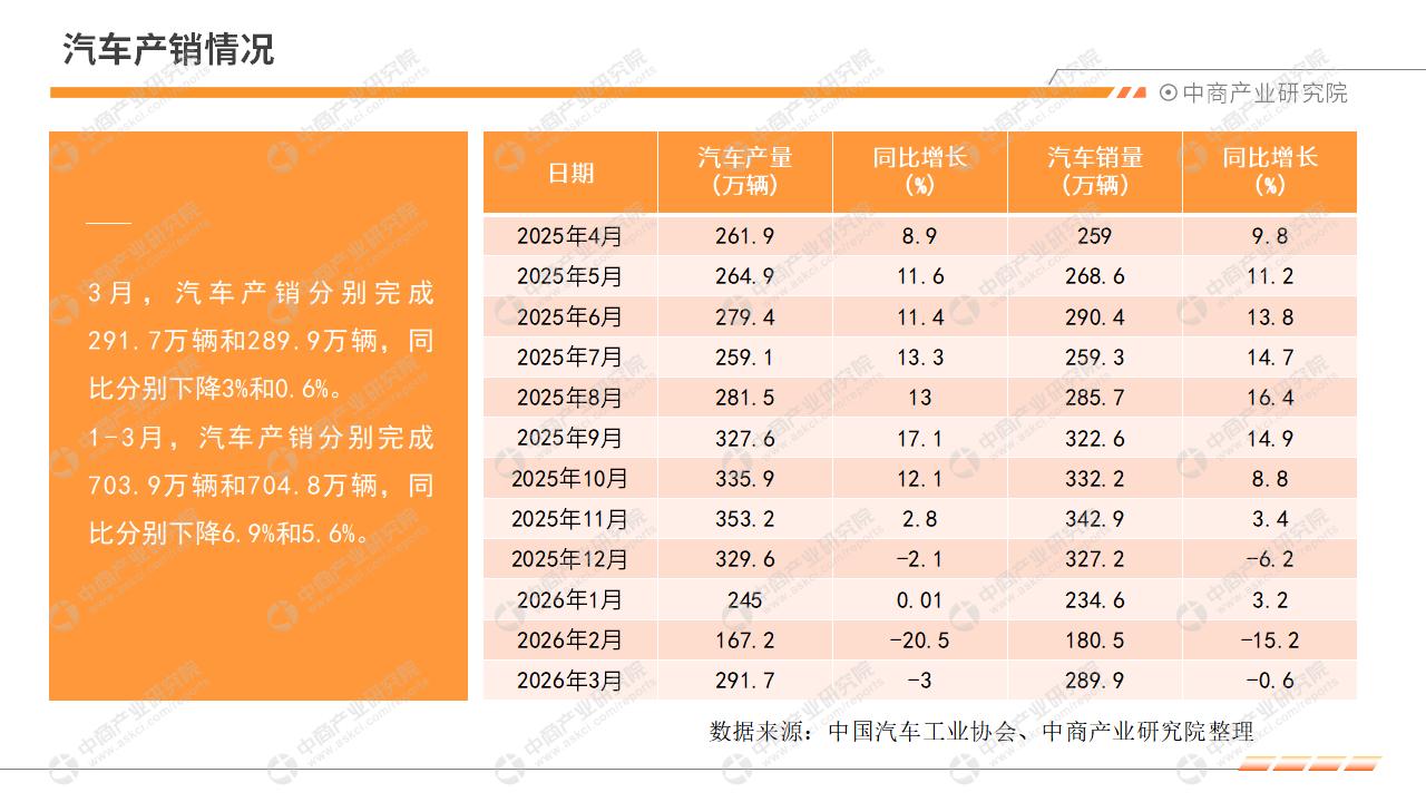 中商情报网讯:2026年3月,全国汽车产销小幅下滑,降幅较2月收窄,释放出向好信号。其中,乘用车市场降幅收窄,商用车销量保持增长,新能源汽车热度持续保持,汽车出口快速增长。