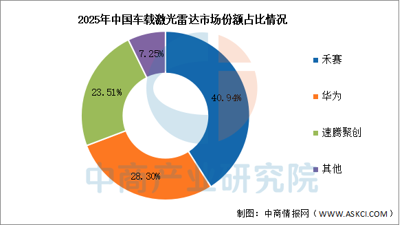 2026年,中国激光雷达车载装机市场中,禾赛以40.94%的市场份额排名第一。华为和速腾聚创分别以28.3%和23.51%的市场份额排名第二第三。