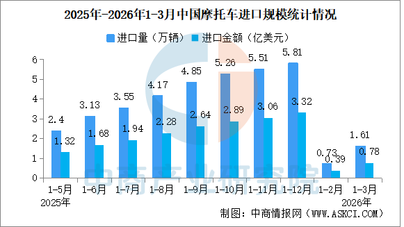 2026年1-3月,我国摩托车整车进口量为1.61万辆,较去年同期增长56.73%,进口额为7777.78万美元,较去年同期增长27.55%。