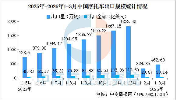 中商情报网讯:2026年1-3月,我国摩托车整车出口量为462.68万辆,较去年同期增长13.49%,出口额为30.14亿美元,较去年同期增长16.93%。其中: