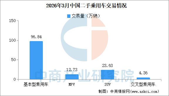 乘用车情况:3月,基本型乘用车共交易96.84万辆,环比增长38%,同比下降3.45%;SUV共交易23.63万辆,环比增长35.43%,同比增长1.36%;MPV共交易12.73万辆,环比增长38.49%,同比增长12.06%;交叉型乘用车共交易4.36万辆,环比增长37.52%,同比下降3.22%。