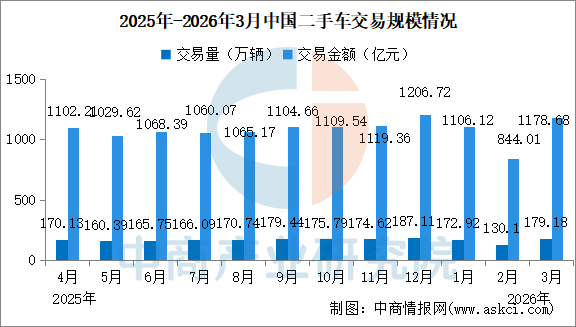中商情报网讯:2026年3月,全国二手车市场交易量179.18万辆,环比增长37.73%,同比增长2.11%,交易金额为1178.68亿元。2026年1-3月,二手车累计交易量482.20万辆,同比增长4.66%,与同期相比增加了21.46万辆,累计交易金额为3128.82亿元。