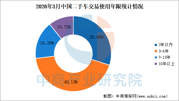 3月,二手车使用年限在3-6年的交易占比最多,占43.13%,环比增长0.27%,较去年同期下降2.57%;使用年限在3年内车型占29.88%,环比增长0.88%,较去年同期增长2.29%;车龄在7-10年的车型占16.28%,环比下降1.01%,较去年同期增长0.27%;车龄10年以上的车型占比为10.72%,环比下降0.15%,较去年同期增长0.02%。