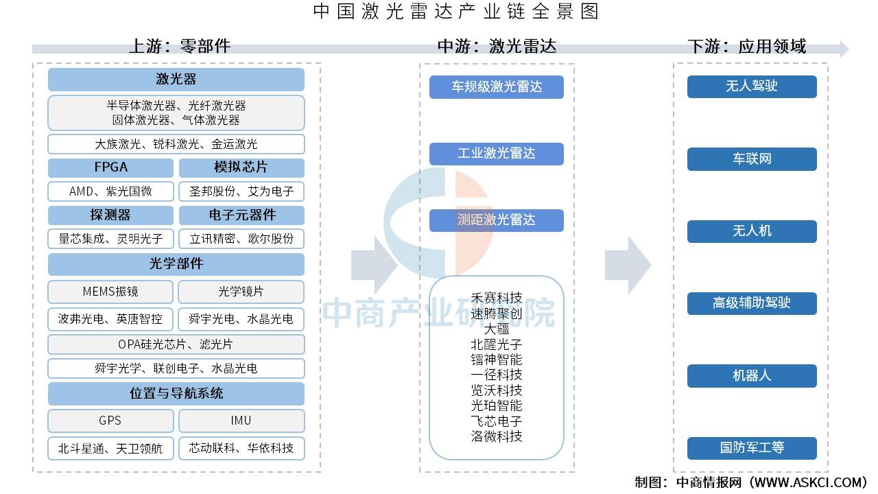 激光雷达产业链上游主要包括激光器、FPGA、模拟芯片、探测器、电子元器件、光学部件、位置与导航系统;中游为激光雷达,可分为车规级激光雷达、工业激光雷达、测距激光雷达;下游应用领域包括无人驾驶、车联网、无人机、高级辅助驾驶、机器人、国防军工等。
