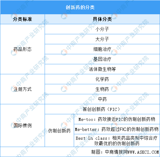 创新药是指含有新的结构明确的、具有药理作用的化合物,且境内外均未上市的药品。按照药品形态,创新药可分为小分子、大分子、细胞治疗、基因治疗、活体微生物等。按照注册方式,可以分为化学药、生物药和中药;按照国际惯例,分为首创创新药和仿制创新药。