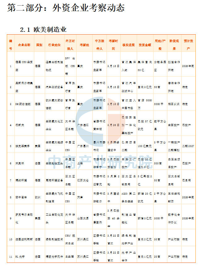 本章节汇总了欧美制造业、日韩企业、港澳台企业考察动态。欧美制造业企业考察热度高涨。