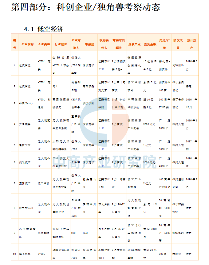 本章节汇总了低空经济、具身智能/人形机器人、人工智能/大数据等领域科创企业/独角兽考察动态。