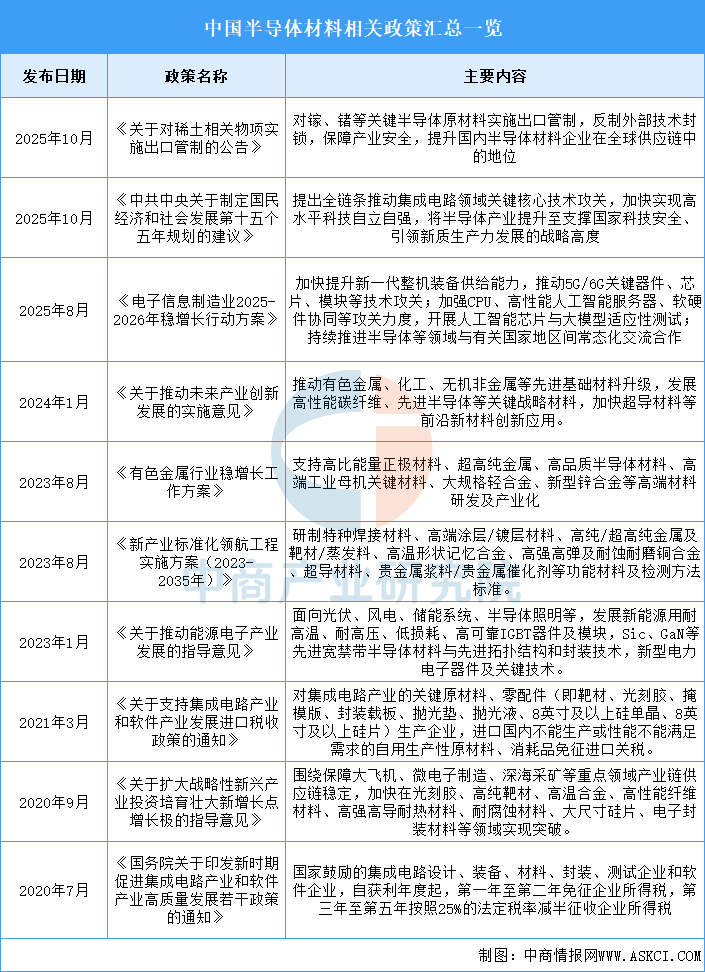 中商情报网讯:半导体材料作为集成电路产业的基石,在集成电路制造技术不断升级和产业的持续创新发展中扮演着重要角色。近年来,我国政府颁布了《关于对稀土相关物项实施出口管制的公告》《中共中央关于制定国民经济和社会发展第十五个五年规划的建议》《关于推动未来产业创新发展的实施意见》等一系列政策法规,为半导体材料行业企业经营发展营造了良好的政策环境。