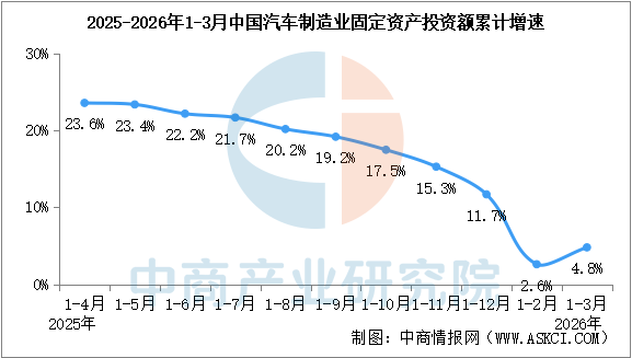 1-3月,全国汽车制造业固定资产投资同比增长4.8%,增速有所放缓。