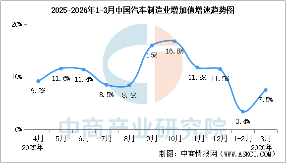 中商情报网讯:3月,全国规上汽车制造业增加值同比增长7.5%,增速较上年同期收窄4个百分点。1-3月,全国规上汽车制造业增加值同比增长5.1%,增速较上年同期收窄6.7个百分点。